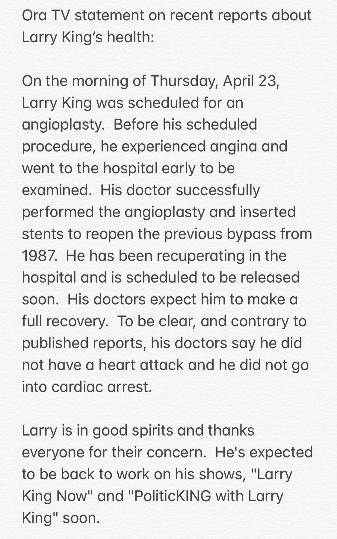 The Truth About Larry King S Covid 19 Risk Factors from img2.nickiswift.com How larry king's health crisis influenced his decision to divorce seventh wife shawn this link is to an external site that may or may not meet accessibility guidelines. A source close to his family told nbc news that the. King, 87, was in the intensive care unit at. Just days after news broke of larry king's hospitalization, he has reportedly been transferred out of the icu unit of a hospital in california. Larry king live would become one of cnn's highest rated shows. News of the sale comes as the former cnn host, who's been faced with several health scares. Then, in april 2019, he had stents implanted, and also had a. The longtime host of larry king live launched the hit cnn show in 1985 and helmed it for 25 years until stepping down from his nightly duties in 2010.